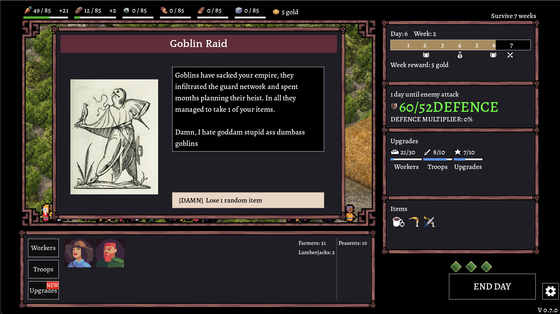 Another thing I noticed is that due to how the resources are chained from a dependency point of view, there's mostly only one way of progressing in the long term: there's some choice of specializing in peasants or warriors in the first weeks or depending on quests, and maybe almost skipping some units (didn't make many spearmen, for example), but overall you have to mostly follow a predictable progression. But maybe that's always the case with turn-based city-builders, dunno (as I said, it's the first one I try).