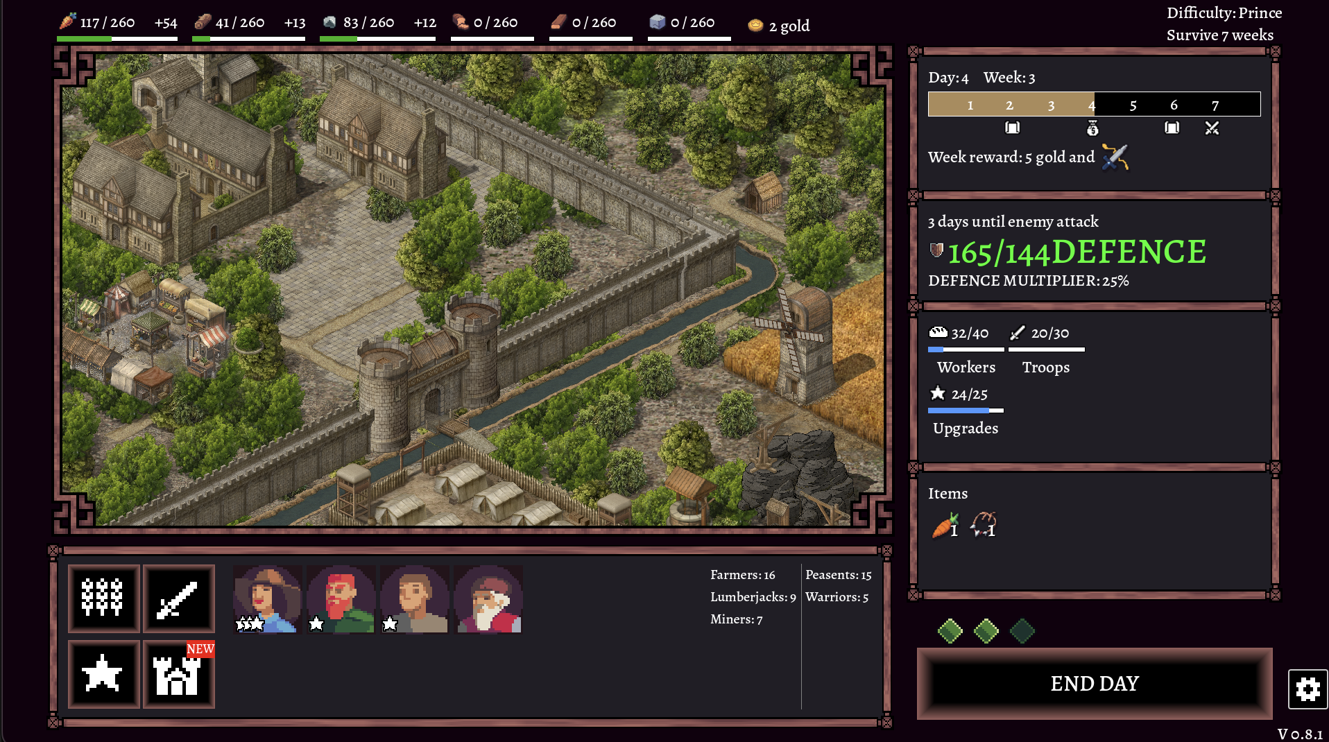 Quite polished, I did not encounter any bugs. First time playing a turn-based city-builder and I won on the first try in the default difficulty, playing mostly by instinct, so maybe kind of easy actually but, at the same time, there was a week where I almost didn't make it, because I chose before the last reward (with extra attack) and failed a quest.